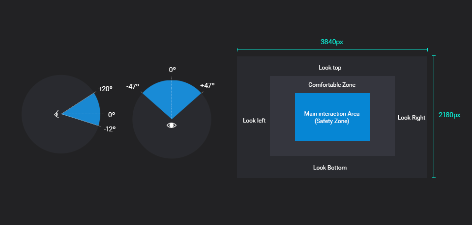 1. 어디에 위치해야 하는가? [ VR 화면은 2D로 그린 UI요소를 3D공간에 재배치하는 과정을 통해 구현된다. ] [ 사용자가 편안함을 느낀느 상하좌우 시야각을 고려하여 캔버스(UI) 사이즈를 정해야 한다. ] [ 사용자가 집중할 수 있는 편안한 시선 범위를 지정해야 한다. ] 모든 360도 영역의 공간 모두를 디자인 하게 되면 사용자가 혼란이 있을 수 있으므로 집중할 수 있는 편안한 시선 범위를 지정해야 한다. 사용자의 관심 영역은 360도 환경에 9분의 1에 해당된다. 직사각형 이미지의 중앙에 위치하며 크기는 4K 해상도(2840k x 2180k) 기준 대략 1200x600 픽셀입니다. 이 공간을 크게는 컴포터블 존과 세이프티 존으로 나뉩니다. * TIP 위 수치는 대략적인 작업 공간을 확보하기 ..